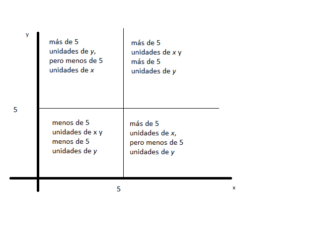 Imaginemos que pensamos en una combinación de consumo de los bienes x e y. Imaginemos que consume 5 de x y 5 de y. Nos puede interesar conocer otras combinaciones de x e y ante las cuales el individuo se encuentra indiferente. Es decir, el conjunto de combinaciones de x e y ante las cuales, si le preguntásemos si prefiere consumir cualquiera de esas combinaciones de x e y o consumir 5 de x y 5 de y, su respuesta fuese «me da igual». Ese conjunto de combinaciones de consumo de ambos bienes, ante las cuales el individuo se encuentra indiferente, es lo que representamos gráficamente como una curva de indiferencia. Podemos acotar un poco donde se encontraría ese conjunto. Imaginemos que queremos saber por donde podría pasar la curva de indiferencia en la que en todos sus puntos la utilidad (la satisfacción) del individuo sería la misma que si consumiese 5 unidades de x y 5 unidades de y. Podemos representar cuatro cuadrantes representados en la figura 1.