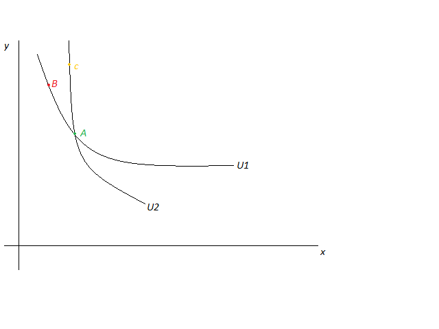 Veamos por qué lo que sucede en la figura 4 es imposible. Imaginemos que, como en la gráfica de la figura 4, hubiese una combinación de los bienes x e y tal como A por la que pasasen dos curvas de indiferencia. El individuo que analizamos se encontrará indiferente ante todas las combinaciones que se encuentran en U1. Por lo tanto le dará igual consumir la combinación A o la B. Pero también estará indiferente entre las que se encuentren en la curva U2, y le dará lo mismo la A que la C. Si le da lo mismo consumir la combinación A que la B y la A que la C, también le tiene que dar igual consumir la B que la C. Pero eso es imposible porque en C puede consumir más de ambos bienes que en B, con lo que tiene que preferir C a B.
